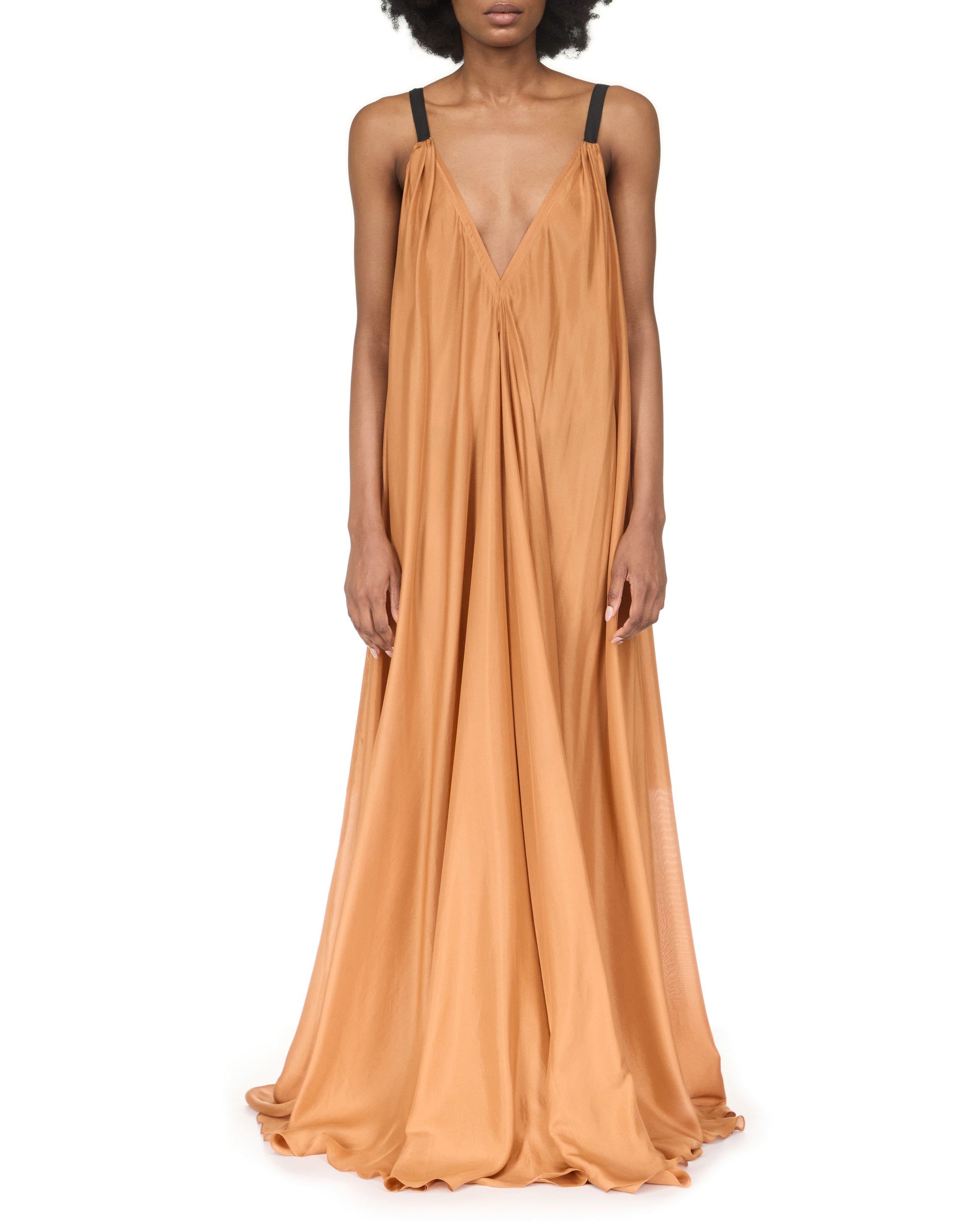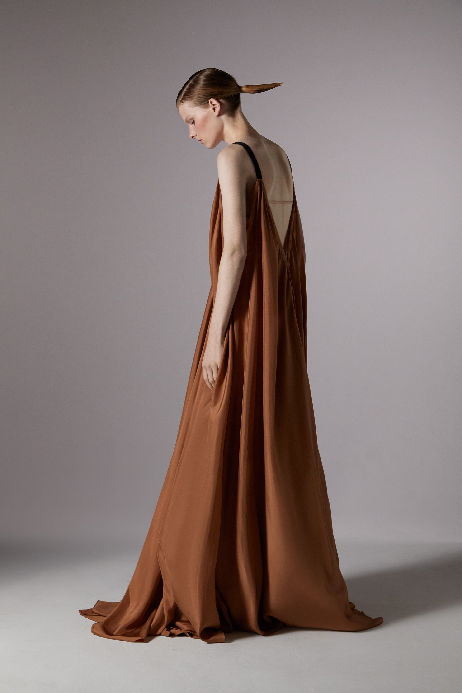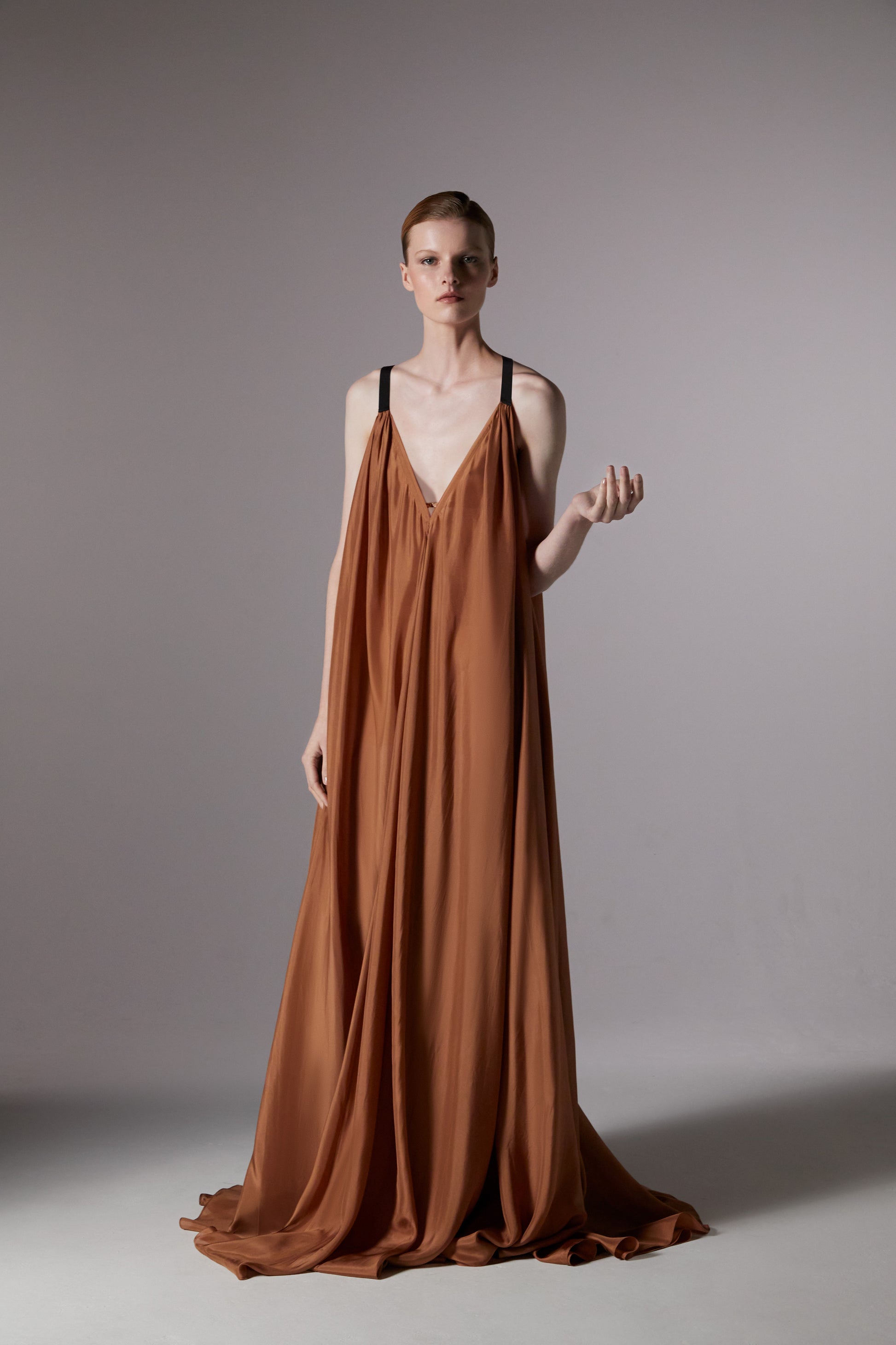 Feather-light yet generously cut from eight metres of bias-cut silk habotai in multidimensional, moody custom colours of Smoke and Palo Santo.