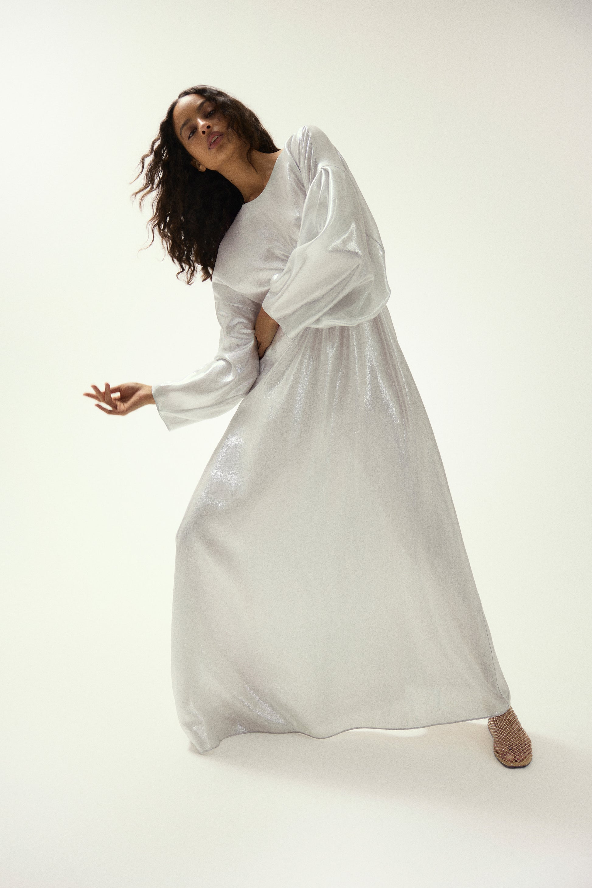 Voluminous sleeves are achieved with pleat details. subtly dropped shoulders keep the silhouette languid and relaxed.